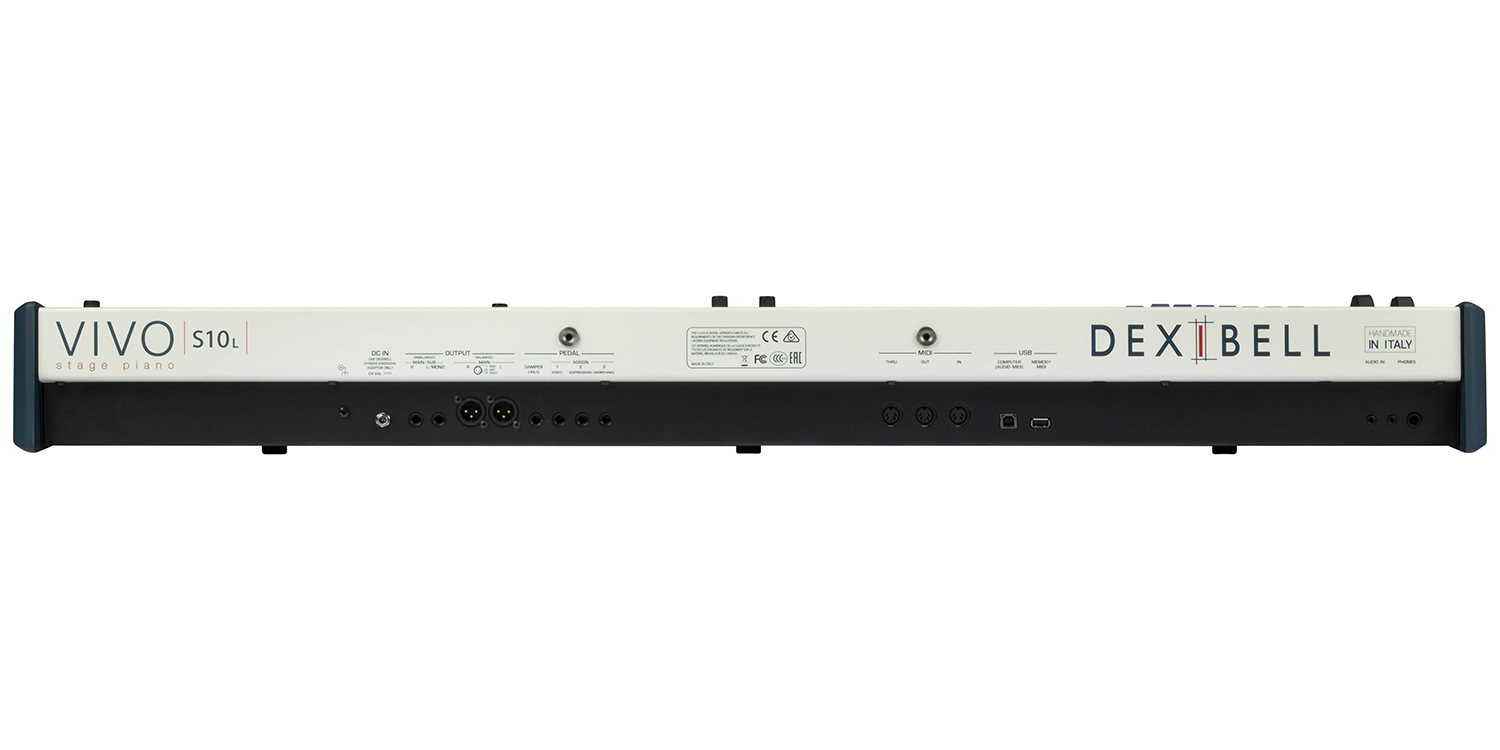 "ErP" LEVEL VI for Echo efficiency on stand-by consumptionVIVO S8 - STAND BY: < 0,2 W MAXIMUM: 18 W "ErP" LEVEL VI for Echo efficiency on stand-by consumptionDimensionsVIVO S10 L - Width 1128 mm - 44,4" Depth 328 mm - 12,9" Height 121 mm - 4,7"VIVO S8 - Width 1270 mm - 50" Depth 354 mm - 13,9" Height 128 mm - 5,0"WeightVIVO S10 L - 12 kg - 26,4 lbVIVO S8 - 17,9 Kg - 39,4 lbAccessoriesVIVO S10 L - Damper Pedal and Music Stand includedVIVO S8 - Damper Pedal includedDraw-FadersVIVO S10 L - 9 MOTORIZED for Tone Wheels/Mixer/EQ/Master Keyboard ControllersVIVO S8 - -BluetoothVIVO S10 L - Streaming Audio Input, MIDI BLE 4.2VIVO S8 - -VIVO S10 LVIVO S8MKeyboardVIVO S10 L - 76 Keys (Synthesizer type) with dynamicVIVO S8M - TP-100 LR: 88 - Keys Hammer action - Triple contactTone GeneratorVIVO S10 L - Advanced T2L: Sampling and Modelling TechnologyVIVO S8M - Advanced T2L: Sampling and Modelling TechnologySamplingVIVO S10 L - XXL wave size, up to 15 seconds on lower piano notesVIVO S8M - XXL wave size, up to 15 seconds on lower piano notesSound Wave FormatVIVO S10 L - 24 bit linear - 48 KHz (Internal processing and DSP at 32 bit floating)VIVO S8M - 24 bit linear - 48 KHz (Internal processing and DSP at 32 bit floating)Digital Analog Convertion (DAC)VIVO S10 L - 24 bit linear - 48 KHz, Dynamic Range, S/N:106dBVIVO S8M - 24 bit linear - 48 KHz, Dynamic Range, S/N:106dBMaximum PolyphonyVIVO S10 L - Unlimited with 320 OscillatorVIVO S8M - Unlimited with 320 OscillatorOrgan TypeVIVO S10 L - TW1, TW2, FARF, VX, PIPE + User1, User2 downloadable from websiteVIVO S8M - TW1, TW2, FARF, VX, PIPE + User1, User2 downloadable from websiteSoundsVIVO S10 L - over 100 Organ Preset + 180 Sounds + User downloadable from websiteVIVO S8M - over 100 Organ Preset + 180 Sounds + User downloadable from websiteMemoryVIVO S10 L - Internal: 81 Unlimited loadable from USB MemoryVIVO S8M - Internal: 81 Unlimited loadable from USB MemoryWave MemoryVIVO S10 L - 3.2 GB fully changable by the user with DEXIBELL and Sound Font formatVIVO S8M - 3.2 GB fully changable by the user with DEXIBELL and Sound Font formatKeyboard ModeVIVO S10 L - 4 Parts (MAIN, LOWER, COUPLED, PEDAL) + 4 MIDI zonesVIVO S8M - 4 Parts (MAIN, LOWER, COUPLED, PEDAL) + 4 MIDI zonesTouch SensitivityVIVO S10 L - 7 Types + FixedVIVO S8M - 7 Types + FixedReverbVIVO S10 L - 24 TypesVIVO S8M - 24 TypesEffectsVIVO S10 L - Rotary, Overdrive, Vibrato/Chorus for Organ + 12 Independent DSP x 17 types (3 x Main, 3 x Coupled, 3 x Lower, 3 x Pedal) using "seamless changes" technology at effect recallVIVO S8M - Rotary, Overdrive, Vibrato/Chorus for Organ + 12 Independent DSP x 17 types (3 x Main, 3 x Coupled, 3 x Lower, 3 x Pedal) using "seamless changes" technology at effect recallMaster EqualizerVIVO S10 L - 3-band Digital EqualizerVIVO S8M - 3-band Digital EqualizerChord EnhancerVIVO S10 L - YESVIVO S8M - YESControllersVIVO S10 L - FX Encoder x 6 Data Entry/Song Level Encoder x 1 Master Volume Knob Wheel 1 & Wheel 2VIVO S8M - FX Encoder x 6 Data Entry/Song Level Encoder x 1 Master Volume Knob Wheel 1 & Wheel 2PlayersVIVO S10 L - .wav, .aiff, .mp3, in all format, frequency and bit rateVIVO S8M - .wav, .aiff, .mp3, in all format, frequency and bit rateRecorderVIVO S10 L - .wav (48 kHz, 32-bit floating) on USB MemoryVIVO S8M - .wav (48 kHz, 32-bit floating) on USB MemoryMaster TuningVIVO S10 L - 415,4 Hz to 466,1 Hz (adjustable increments of 0,1 Hz)+ 2 Preset (440 Hz, 442 Hz)VIVO S8M - 415,4 Hz to 466,1 Hz (adjustable increments of 0,1 Hz)+ 2 Preset (440 Hz, 442 Hz)TemperamentVIVO S10 L - 9 TypesVIVO S8M - 9 TypesUser TemperamentVIVO S10 L - YES: 3 UserVIVO S8M - YES: 3 UserRhythm PatternsVIVO S10 L - X MURE APP for i-Phone and i-Pad (FREE) with multitracks audio patternsVIVO S8M - X MURE APP for i-Phone and i-Pad (FREE) with multitracks audio patternsConnectorsVIVO S10 L - OUTPUT: MAIN Balanced: XLR (LR) MAIN / SUB Unbalanced OUTPUT jacks (L/MONO, R) 1/4-inch phone type