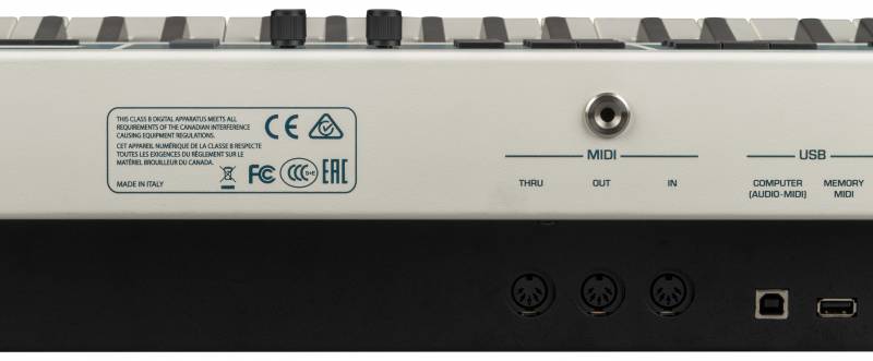 AUX IN: 1 jack (stereo mini-jack)BluetoothStreaming Audio Input, MIDI BLE 4.2DisplayGraphic LCD 128 x 64 dots Organic LED, high contrast typePower ConsumptionSTAND BY: < 0,2 W MAXIMUM: 18 W "ErP" LEVEL VI for Echo efficiency on stand-by consumptionDimensionsWidth 1077 mm - 42,4" Depth 370 mm - 14,5" Height 136 mm - 5,3"Weight11,8 Kg - 26 lbAccessoriesDamper Pedal included -